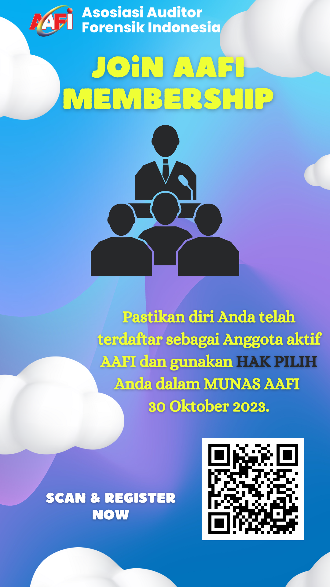 Asosiasi Forensik Auditor Indonesia (AAFI WERI) mengundang Bapak/Ibu Anggota Aktif AAFI WERI untuk melakukan pendaftaran Musyawarah Nasional (MUNAS) AAFI WERI yang direncanakan akan dilaksanakan pada 30 Oktober 2023. Silakan melakukan pendaftaran di website AAFI WERI dengan alamat www.aafiweri.org/2023. Jangan lupa siapkan Sertifikat Certified Forensic Auditor (CFrA) dan Bukti Iuran Tahunan AAFI WERI saat pendaftaran.