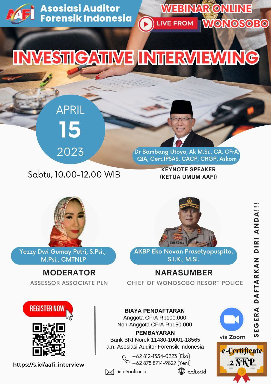 Asosiasi Forensik Auditor Indonesia (AAFI WERI) mengundang Bapak/Ibu dalam Webinar Online dengan Tema INVESTIGATIVE INTERVIEWING