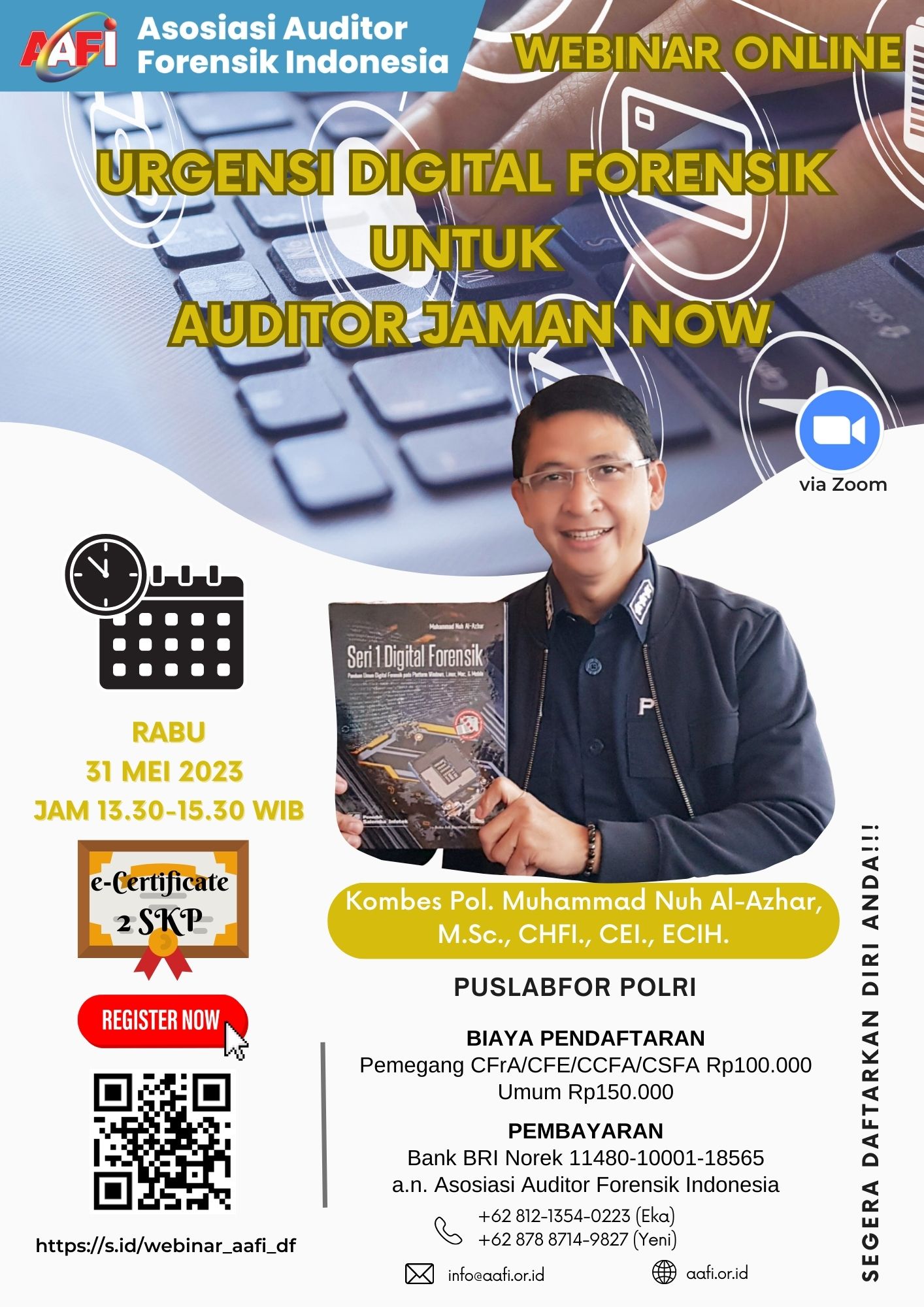 Asosiasi Forensik Auditor Indonesia (AAFI WERI) mengundang Bapak/Ibu dalam Webinar Online dengan Tema "URGENSI DIGITAL FORENSIK UNTUK AUDITOR JAMAN NOW" yang menghadirkan Ahli Digital Forensik, Komisaris Besar Polisi Muhammad Nuh Al-Azhar, S.T., M.Sc., CHFI., CEI., ECIH. dari PUSLABFOR POLRI.